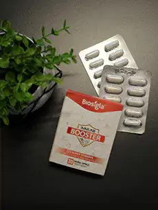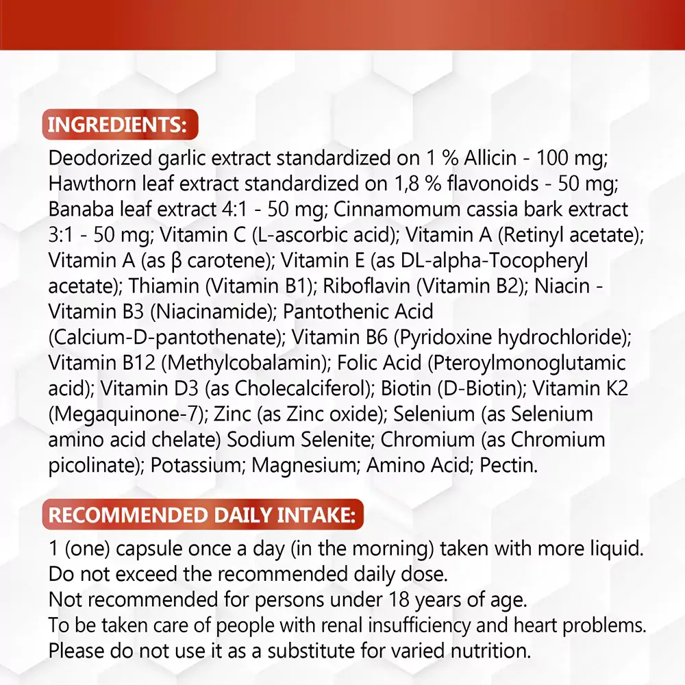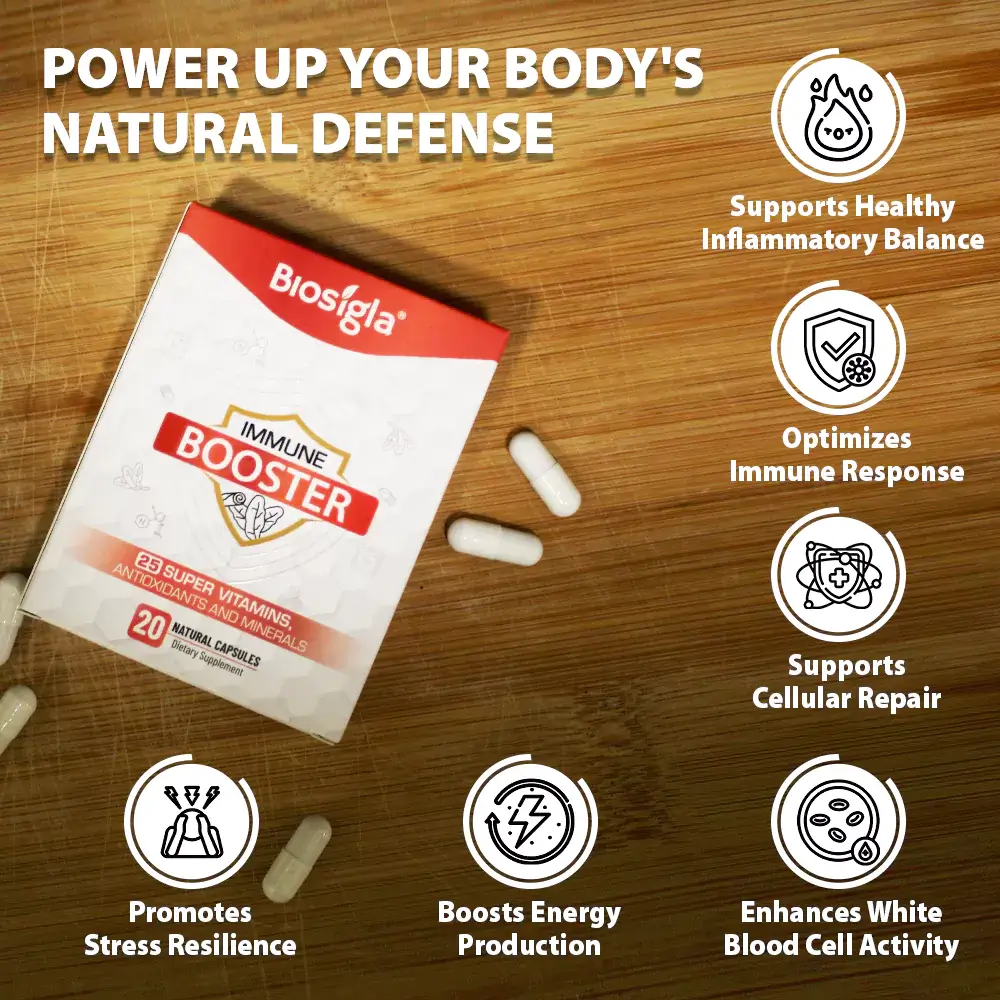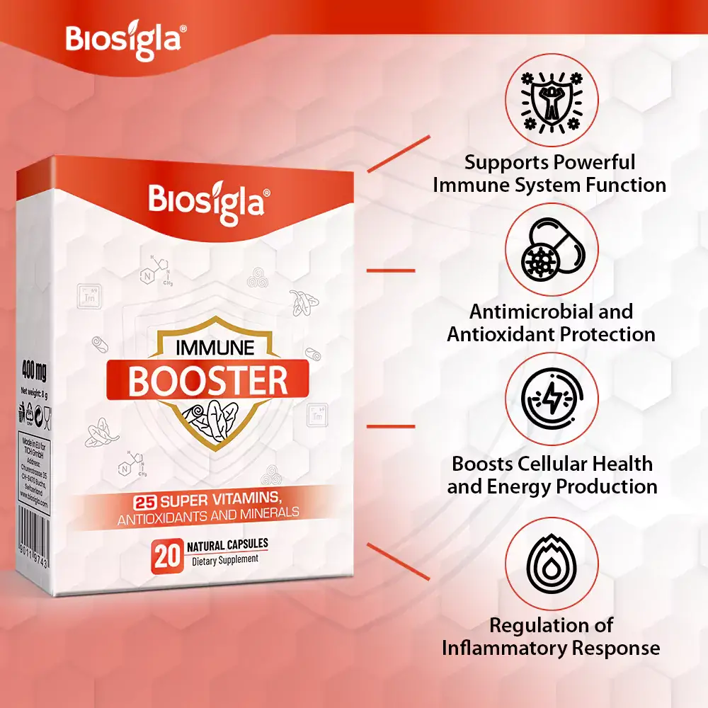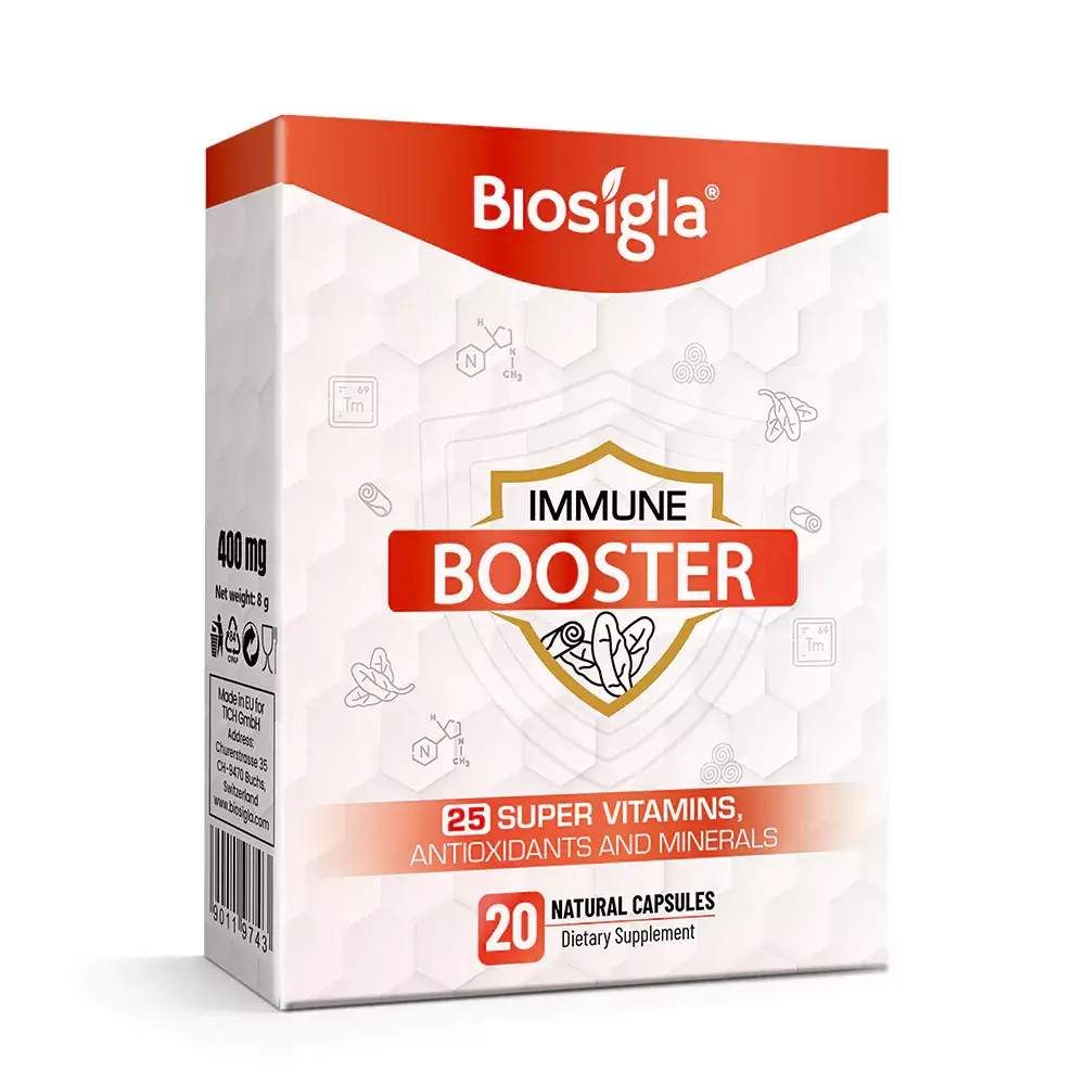Immune Booster contains a blend of carefully selected ingredients, each chosen for their specific benefits: Vitamin C, Vitamin A, Vitamin E, B Vitamins (B1, B2, B3, B6, B12, Folic Acid), Zinc, Selenium, Vitamin D3, Magnesium, Calcium, Potassium, Garlic, Banaba Leaf Extract, Cinnamomum Cassia Bark Extract, Biotin, Pectin, and Amino Acids.
