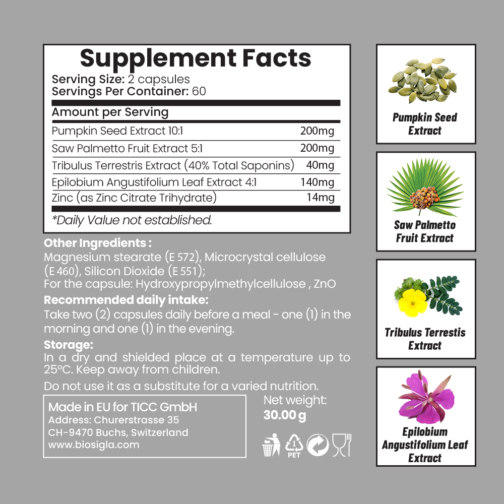 Saw palmetto, Tribulus Terrestris and Pumpkin Seeds have been touted for their positive role in male reproductive health and supporting healthy prostate function.