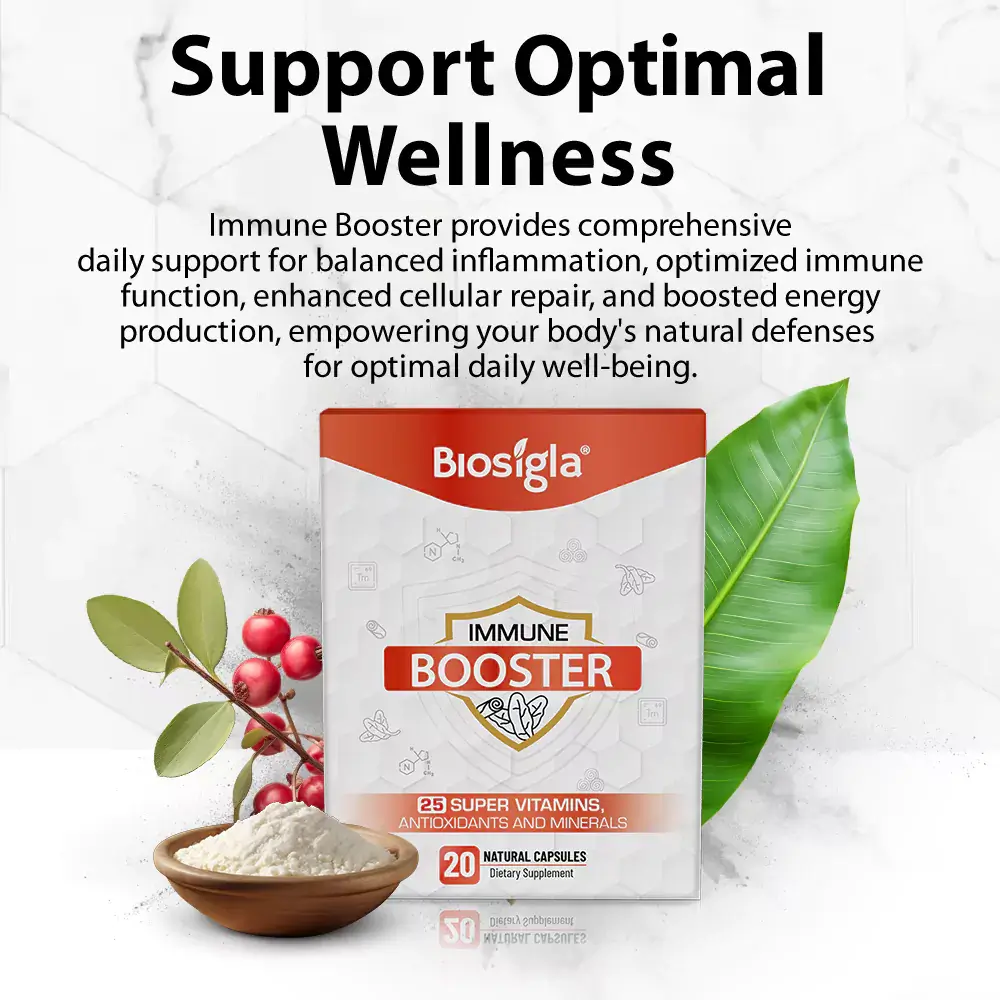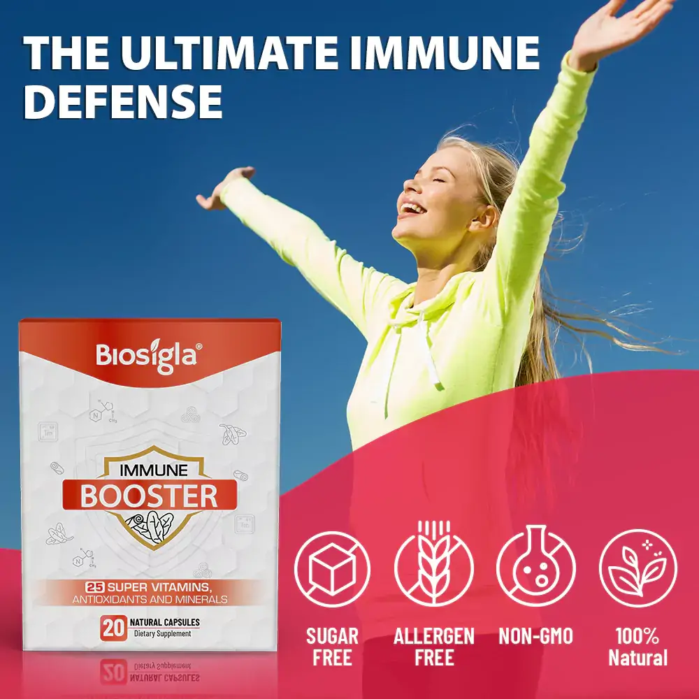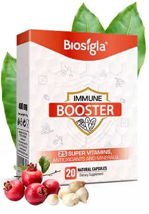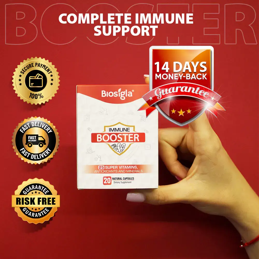 Immune Booster contains a blend of carefully selected ingredients, each chosen for their specific benefits: Vitamin C, Vitamin A, Vitamin E, B Vitamins (B1, B2, B3, B6, B12, Folic Acid), Zinc, Selenium, Vitamin D3, Magnesium, Calcium, Potassium, Garlic, Banaba Leaf Extract, Cinnamomum Cassia Bark Extract, Biotin, Pectin, and Amino Acids.